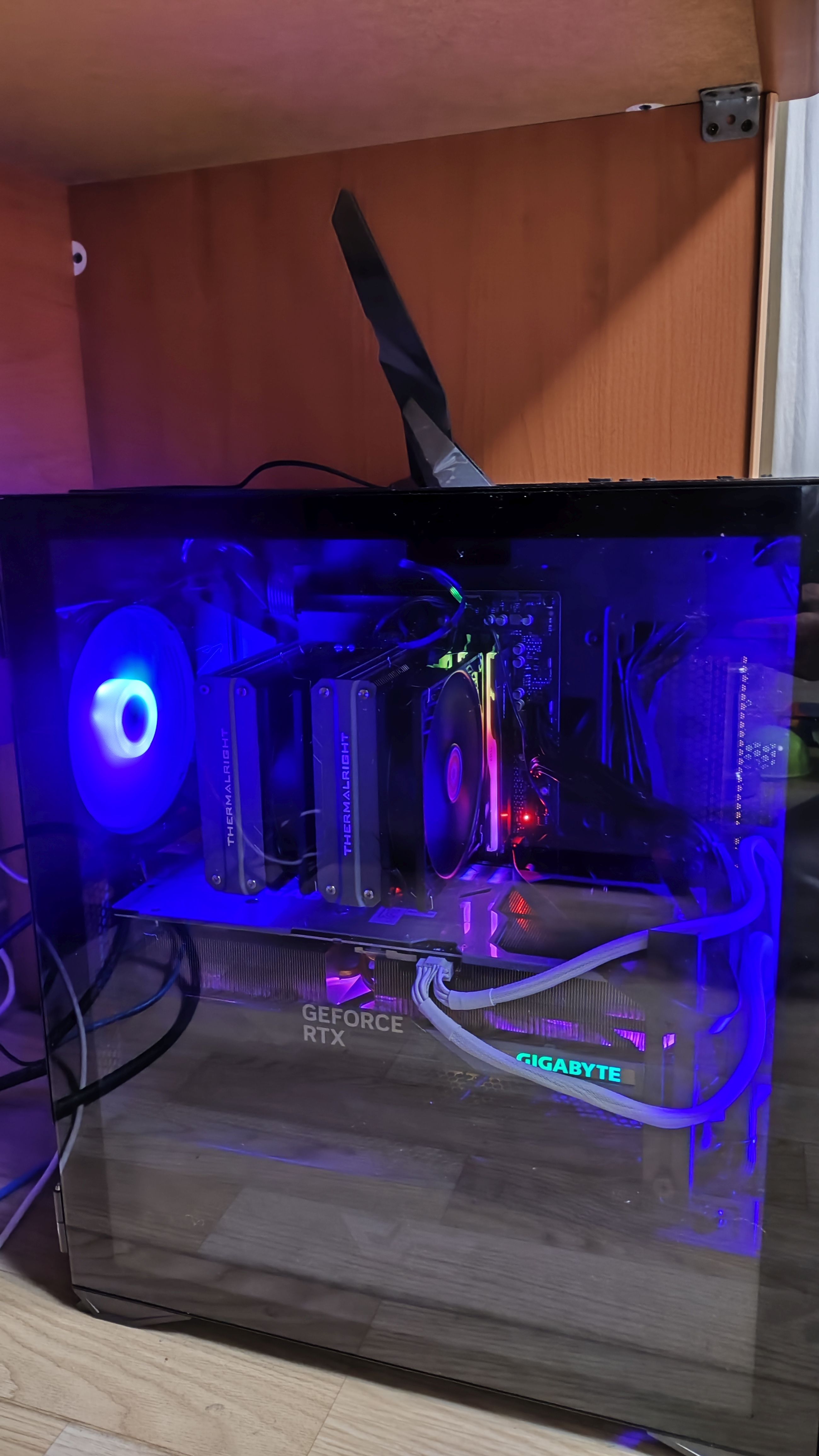 완전 설치후. 배선은 아직 대충만... 케이스 위에 얹어 있는게 와이파이입니다. 바닥이 자석으로 되어있어서 케이스 철판 어디에 붙여도 철썩 붙어있어서 케이스 기울여도 아무 문제없었어요.